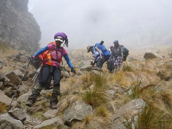 About three-quarters of an hour before Otto and I reached the top of Judge Pass, we met this party coming down the pass. The group consisted solely of black African climbers. This underscored the fact that I was in the new all-race South Africa. When I’d previously climbed in the Drakensberg – on three occasions in 1961 and 1962 – South Africa was in the midst of its apartheid era. People of colour simply did not climb for fun, and it would have been impossible to have seen a party like this 50 years ago. |