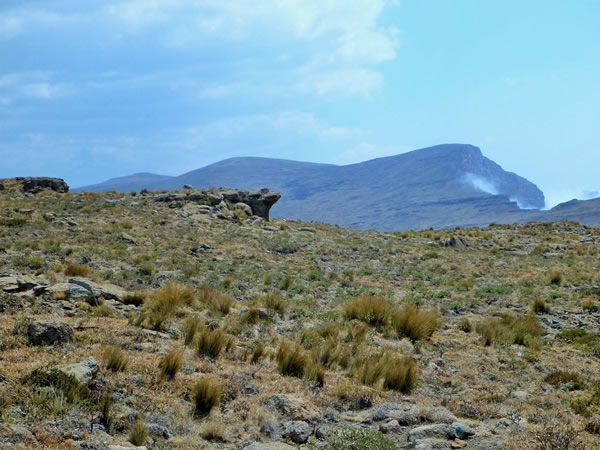 Having reached the Lesotho plateau, we could now see Mafadi (3,450 metres / 11,319 feet above sea-level), the highest mountain in South Africa. It’s the peak on the horizon that’s furthest to the left. On Mafadi’s right, almost in the middle of the picture, is Injisuthi Dome (3,410 metres / 11,187 feet above sea-level and the second-highest mountain in South Africa). To the right of Injisuthi Dome is the Trojan Wall (3,354 metres / 11,004 feet) with its eastern edge a part of the dramatic Drakensberg escarpment. The South Africa / Lesotho border follows the east / west watershed, which basically runs along the far horizon in this photograph. As a result, all three peaks – Mafadi, Injisuthi Dome, and Trojan Wall – are in both South Africa and Lesotho. |