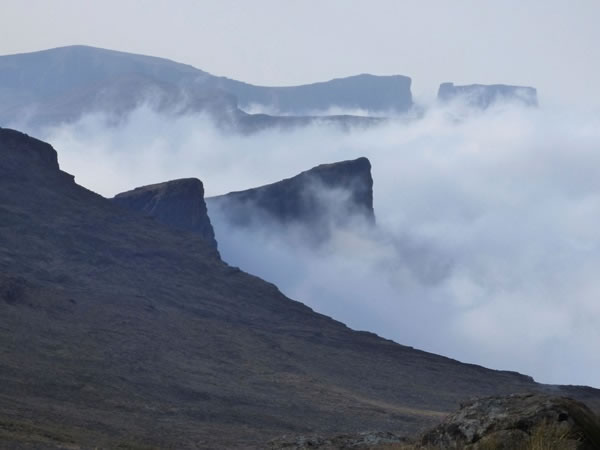 Looking down from our campsite at the escarpment walls below us, and at a sea of clouds below the cliffs that are hundreds of metres high.