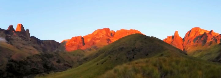 The first rays of the sun struck the escarpment at 5:48 am and turned the uppermost cliffs of Drakensberg gloriously red.