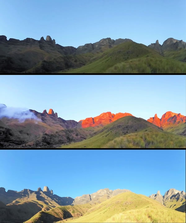 I deliberately put these three photographs together into one picture to accompany an article that I had published in the 2019 edition of the New Zealand Alpine Journal. In the article, I commented, “Unlike my three previous Drakensberg trips in the early 1960s, when the best views had without exception been from the tops of the mountains, my most memorable views in 2019 were looking back up at the mountains.” The three panoramic views looking back up at the Drakensberg escarpment were taken before, during, and after sunrise on Wednesday, 25 September 2019, at 5:45 am, 5:50 am, and 6:35 am respectively. The Injisuthi Buttresses (3,202 metres / 10,505 feet and 3,212 metres / 10,538 feet) are in the centre of each panorama; the Triplets (2,946 metres / 9,665 feet, 3,150 metres / 10,334 feet, and 3,190 metres / 10,466 feet) dominate the left-hand skyline; and the Molar (3,045 metres / 9,990 feet) and the Ape (3,044 metres / 9,987 feet) can be seen near the right-hand edge of each picture. |