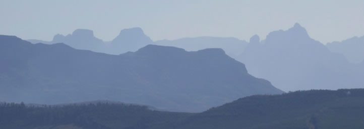 When I was nearly back at Little Acres, I had a wonderful view in the distance of an area where I had climbed in 1961 and 1962, namely the Cathedral Peak region of the Drakensberg mountains. Cathedral Peak (3,004 metres / 9,855 feet) is the prominent mountain near the right-hand edge of the furthest range that's silhouetted in this panoramic photograph. On its immediate left is the Bell (2,930 metres / 9,613 feet), while the Inner and Outer Horns (3,005 and 3,006 metres / 9,859 and 9,862 feet) dominate the right-hand edge of the picture. What a great way to end a superb trip! (This is the last picture in this album.) |