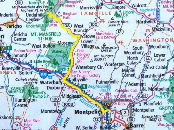 … to drive from Montpelier to Mt Mansfield. The route I took – on US interstate highway 89 and on Vermont state routes 100 and 108 – is shown in yellow on this map.