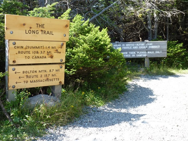 The hike from the Visitor Centre to the summit of Mt Mansfield is along Vermont’s Long Trail – a hiking trail that spans the length of the state. It goes from the Massachusetts / Vermont state line in the south all the way north to the Canadian border. It’s 273 miles / 439 kilometres long. Despite the fact that I’d be hiking only 0.5 per cent of the Long Trail in order reach the summit of Mt Mansfield, I was delighted to be walking on it. On the right-hand side of the picture, there’s another sign about the fragile alpine zone plants on Mt Mansfield. |