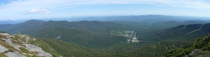 A three-shot panoramic photograph of the view looking south-east from the summit of Mt Mansfield. The Stowe Mountain Resort complex, which is at the foot of the peak, is to the right of the middle of the picture.