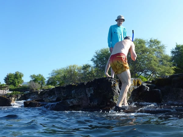 While waiting for the weather to improve, we also went snorkelling. Hawaii’s a snorkelling paradise: the sea is warm, there are at least as many fish as there are at the Great Barrier Reef, and the reefs are far more accessible in Hawaii than they are in Australia. In this photo, Tom Fitch is watching Eric emerge from the water at Honaunau’s Two Step Beach, which is only about 4 miles / 6 kilometres from Tom and Rosemary’s home. |