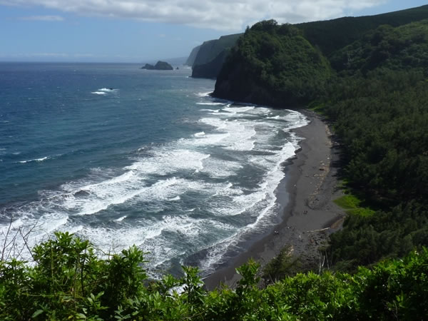 Looking down across the black sand beach at the mouth of the Pololu valley and towards cliffs on the north-east coast of the island of Hawaii.