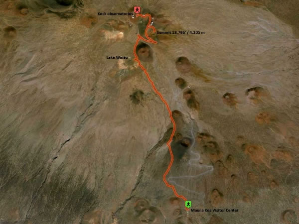 Because I used a small GPS while we were on the mountain, the route we took from the Visitor Center (which is just below the little green figure near the bottom of the picture) to the summit of Mauna Kea is shown accurately in orange on this satellite image of the mountain. Basically, we headed north. |