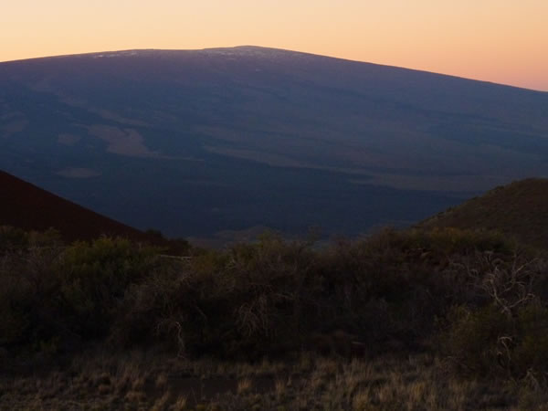 At 6:50 am there was an attractive red glow on Mauna Loa, the 13,679-foot / 4,169-metre high volcano that dominates the southern two-thirds of the island of Hawaii. If Mauna Kea can be said to be the word’s tallest mountain (from its base below the sea to its 13,796-foot summit), then – in a similar manner – Mauna Loa can be described as the world’s largest mountain. |
