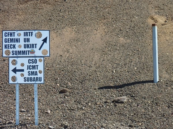 We reached a fork in the road and, following Yogi Berra’s advice, took it. (In fact, because we were going to the summit, we took the right-hand fork.) The other six names on the upper sign are names of (or abbreviations for the names of) telescopes near the summit. UKIRT, for example, stands for United Kingdom Infrared Telescope. |