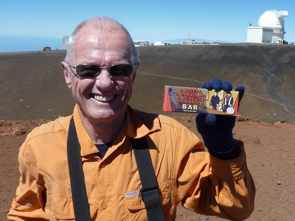 Peggy Wall, whom I first met when I was an AFS student in Ohio in 1962-63, has encouraged me and helped me on many of my US highpointing expeditions. For Christmas 2013, she not only sent me a card with a picture of Mauna Kea on it, but also enclosed a fruit-and-nut bar for me to eat on the mountain. It was nutty in more ways than one: it was produced by the Unemployed Philosophers Guild and contained jokes (such as ‘A priest, a rabbi, and a penguin walk into a bar … and the bartender says, I know, I know – if your flock calls, you’re not here.’). I duly obeyed Peggy: I carried the bar to the top of the mountain and really enjoyed eating it. |
