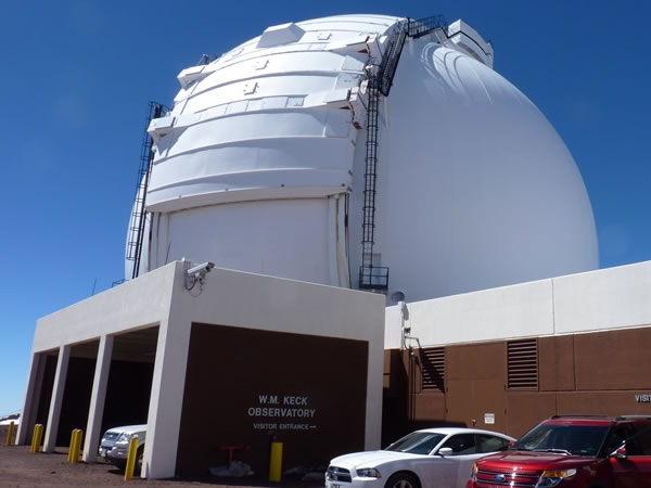 A small information centre in the Keck observatory complex has toilets and a water-fountain, so Eric and I availed ourselves of the observatory’s facilities. However, when I entered this large steel and concrete structure, my small GPS lost its satellite connection, which is why my map of our route on Mauna Kea (which forms the 64th picture in this web-album) ended at the Keck observatories. |