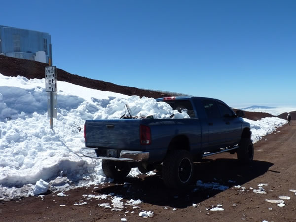 While Eric and I walked down the gravel road that’s below the Keck observatories we passed this pick-up truck and a couple doing something we gather is fairly common: namely, filling the “ute” with snow for their children to play with down at sea-level. |