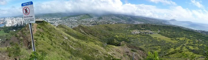 A three-shot panorama of the view from the summit of Diamond Head. Waikiki beach and the hotels and apartments adjoining it are visible on the left-hand edge of the picture; Maunalua Bay is on the right-hand edge.