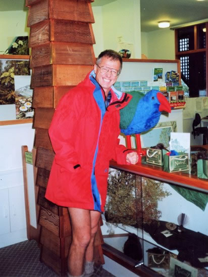 After landing at the Te Anau / Manapouri airport, we caught a taxi into Te Anau and checked in at the Fiordland National Park’s visitor centre, where David took this picture of me and a large toy takahe – a bird that was thought to have been extinct until it was rediscovered in 1948 in the Murchison mountains on the other (i.e., on the western) side of Lake Te Anau. |