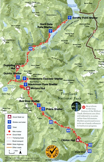 This photograph of a map in a DoC pamphlet about the Milford Track shows where we went. On Thursday afternoon, 4 April 1996, David and I walked from Glade Wharf to the Clinton Forks Hut. On Friday, 5 April, we hiked largely alongside the Clinton river from the Clinton Forks Hut to Mintaro Hut. The following day we climbed up, over, and down the Mackinnon Pass and spent our third and final night on the track in Dumpling Hut. On Sunday, 7 April, we walked to the end of the track at Sandfly Point, where we caught a boat to Milford and a bus back to Te Anau. |