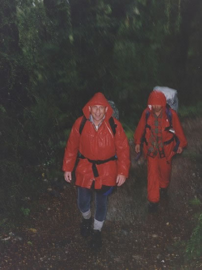 … David wore polypropylene leggings – but only on the first afternoon’s brief walk from Glade Wharf to the Clinton Forks Hut. For the rest of the hike, David also opted to wear shorts.