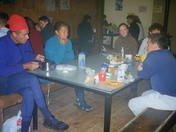 The three DoC huts – the Clinton Forks, Mintaro, and Dumpling huts – used by “freedom walkers” on the Milford Track each accommodate 40 hikers. As a result, David and I hiked the track together with 38 other people. I took this photograph of David talking to the two people opposite him, Richard Kennedy (with the red hat) and his wife, Treacy Roberts-Johnson, while we were having breakfast in Clinton Forks Hut. They are from British Columbia, where Richard is a doctor and Treacy’s a teacher. In 1995, they had worked for an aid project on the island of Tanna in Vanuatu, and when we met them, there were on their way back (via a somewhat circuitous route) to Canada. We really enjoyed their company, and spent quite a lot of time talking to them. |