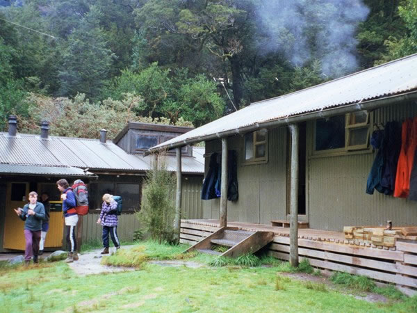 Hikers preparing to leave the Clinton Forks Hut after breakfast on Good Friday, 5 April 1996.