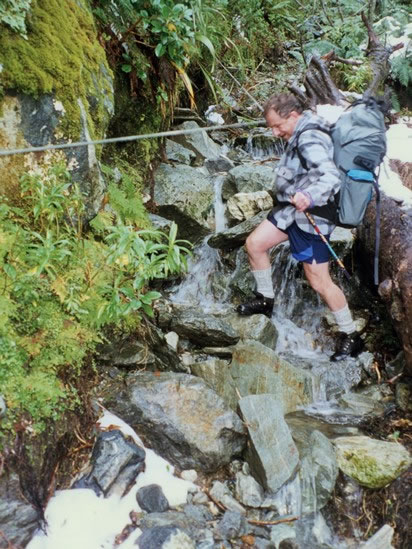A tricky little stream-crossing with a fixed-rope in place for safety’s sake.