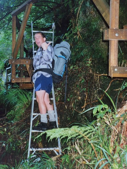 Not far from our final night’s accommodation, the track had fallen away, and we had to regain it by climbing up a stepladder.