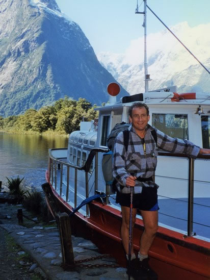 David about to board the ferry at Sandfly Point. The lower portions of Mitre Peak are visible in the upper left-hand corner of the picture.