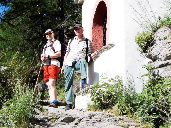 Eric Hodge (left) and Roger Powell (right) arrived in Saas-Grund a day later than planned after their London to Geneva flight was delayed by thunderstorms. As a result, our first acclimatisation hike together was on Friday, 6 August 2004. We left Saas-Grund and headed up a narrow rocky path that goes to Saas-Fee. We paused outside a tiny wayside chapel … |