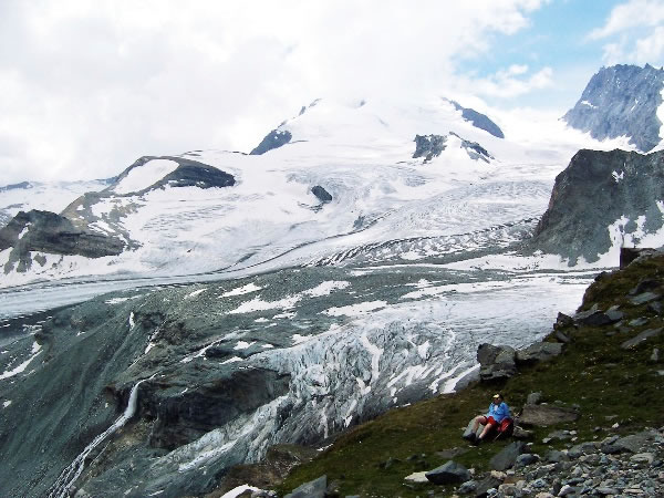 The hike from Plattjen Berg to Britanniahütte took us two hours, and as we’d reached Britanniahütte at 1:30 pm, we had our lunch resting on rocks below the hut. The Allalin glacier dominates the centre of the picture. On 30 August 1965, a massive avalanche at the terminus of the glacier killed 88 Mattmark dam construction workers. |