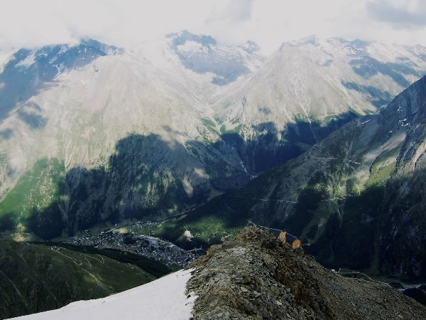 As this photo taken from above Mischabelhütte shows, the hut is a large two-unit building perched on steep rocky slopes below a mountain called Ulrichshorn (3,925 metres / 12,877 feet).