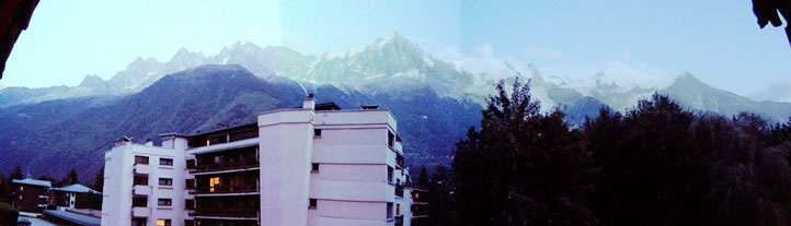 As this photo-stitch shows, we had a great view from our bedroom balcony. Mont Blanc is about a quarter the way in from the right-hand edge of the picture. The prominent rock spire in the centre is the Aiguille du Midi (3,842 metres / 12,605 feet).