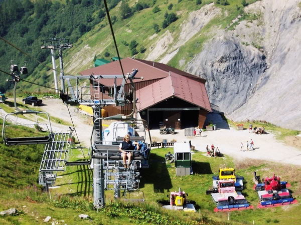 Looking back down onto Caroline Ogden as she rode the chairlift from Charamillon to Les Autannes. The Charamillon cable car station dominates the centre of the picture.
