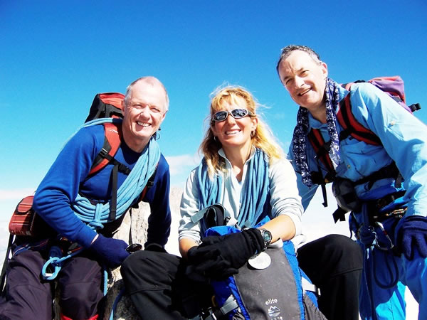 A happy summit shot on Tęte Blanche taken at about 10:30 am and featuring – from left to right – Nigel Roberts, Caroline Ogden, and Eric Hodge. The top of Tęte Blanche was literally the highpoint of Eric’s and my acclimatisation programme. After descending Tęte Blanche and going back initially to the Albert the First hut and then to Chamonix, it was time tackle our main goal … |