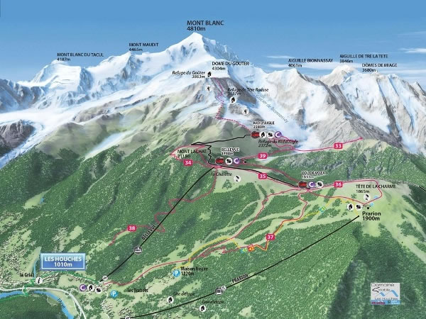 … Mont Blanc. This diagram shows the route we took to reach the top of Mont Blanc. First, we went to Les Houches, a small village about 8 kms / 5 miles south-west of Chamonix. We then caught an aerial cable car from Les Houches to Bellvue, where – after waiting for a while in the sunshine on a pleasant summer’s morning – we caught a train to Nid d’Aigle. We then hiked and scrambled our way up to the Refuge de Goûter, where we spent the night prior to climbing to the summit of Mont Blanc.