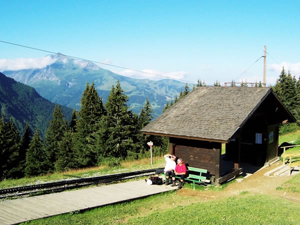 A couple of climbers waiting at the Bellevue station for the cog-rail train.