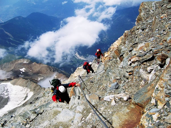 The climb up the Aiguille du Goûter is a steep scramble that’s aided – in places – by fixed wire-ropes.