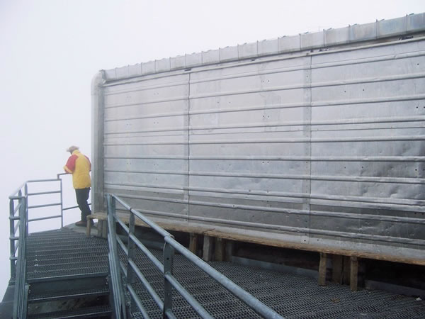 The Goûter hut – the Refuge du Goûter – is perched between snow and rock at the top of the Aiguille du Goûter. In the late afternoon, the weather worsened and the valleys below us disappeared from view.
