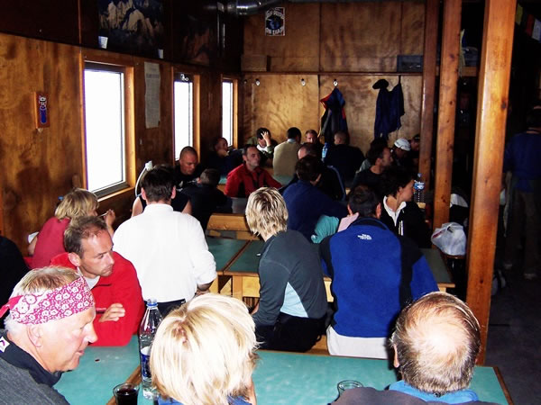As was the case in the other European alpine huts we’d been to, meals were also served in the Goûter hut. This is a picture of people sitting, resting, and chatting before dinner. Incidentally, we saw the man with the pink bandanna (in the lower left-hand corner) earlier in this web-album: he was one of the climbers waiting for the cog-railway train at the Bellevue station. |