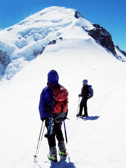 We had the mountain almost to ourselves. Two hours after leaving the Goûter hut, we could see the Vallot emergency shelter after we’d crested the Dôme du Goûter. Five climbers were coming down the mountain towards us. They were the only climbers we saw all day, and after they passed us, we were the only climbers on the uppermost slopes of Mont Blanc’s Goûter route. |