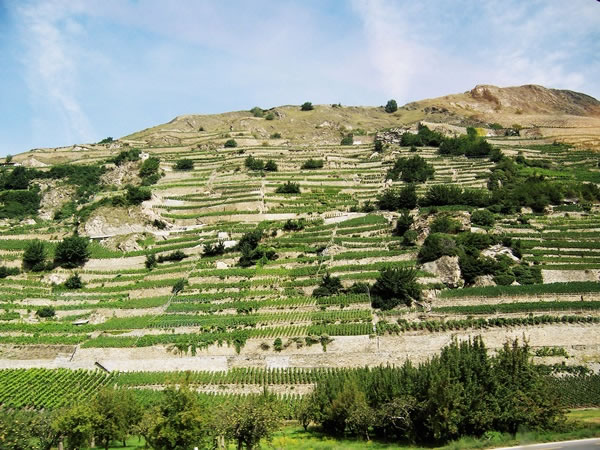 The train passed through vineyards perched precariously on the steep slopes of Swiss hills beside the tracks.