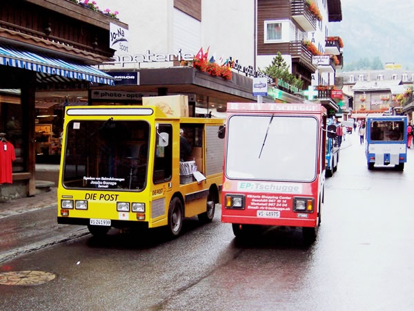 Cars are not allowed in Zermatt’s narrow streets – instead, electric vehicles, which resemble British milk floats or golf carts, swoosh up and down the village streets.