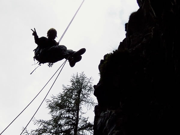 The four of us then walked down to and abseiled into the Gornerschlucht – the Gorner gorge. This is a photo of Grégoire Sauget abseiling into the head of the gorge.