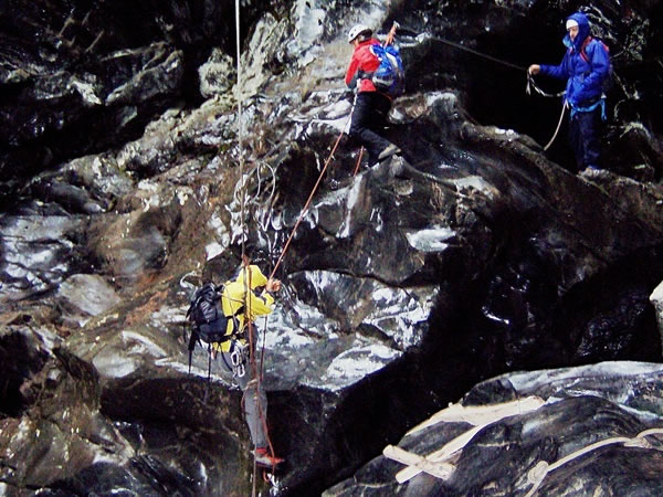 A particularly tricky section of the gorge: descending smooth rocks in light rain.