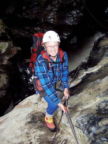 Greg took this photo of me on marble-smooth rocks as I climbed up and out of an extremely narrow section of the gorge.