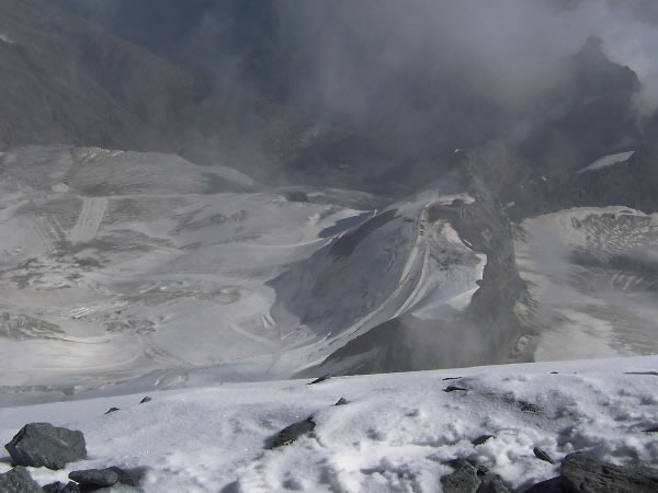 Another photo from the summit of Allalinhorn, this time looking down onto the Allalin ski-fields (which are in the left-hand half of the picture). The circular building perched on a ridge about 30 per cent in from the right-hand edge of the photo is a restaurant on top of the Allalin station. |
