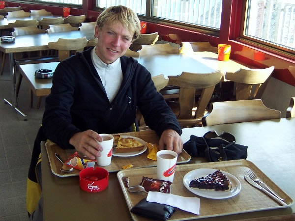 After we completed the climb, Greg and I treated ourselves to a late breakfast of hot chocolate and pie in the restaurant above the Allalin station.