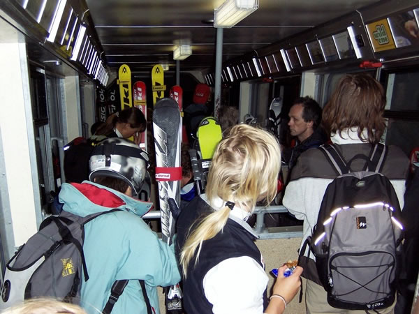 Almost empty on the way up, the under-ice train was packed with skiers when we headed back down to Saas-Fee.
