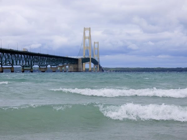 On Wednesday, 23 August 2017, I headed north from Grand Rapids. The Mackinac suspension bridge was opened in 1957 and links the lower and upper peninsulas of Michigan. I took this photograph from Mackinaw City, and it looks north across Lake Huron both at the Mackinac bridge and at the state’s Upper Peninsula (which is five miles / eight kilometres away). |