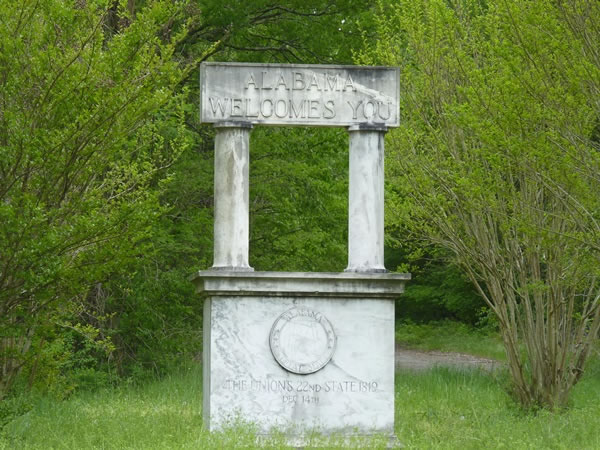 … an older structure resembling the ruins of a Greek temple saying ALABAMA WELCOMES YOU.