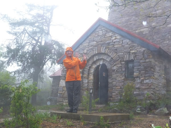 Because it was raining, I put my small waterproof camera on a tripod and quickly a took a photograph of myself using my head to represent 20 and four fingers on each hand to indicate that Mt Cheaha was the 28th US state highpoint I’d either climbed or visited. |