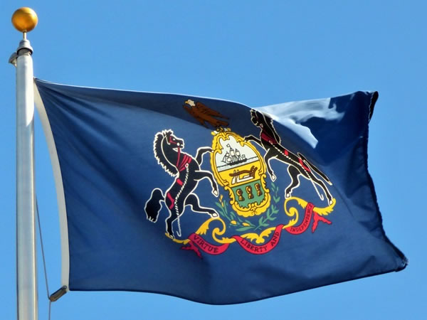 On Pennsylvania’s state flag, it’s not a case of “horses for courses”, but is rather a case of horses representing agriculture, while the eagle at the top of the flag illustrates Pennsylvania’s loyalty to the United States, which is certainly fitting: the Declaration of Independence was signed in Pennsylvania in 1776; the United States constitution was written in Pennsylvania in 1787; and possibly the most crucial battle in the civil war that was fought to keep the United States intact took place in Pennsylvania in 1863. |